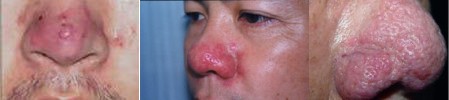 酒糟鼻俗称红鼻子或红鼻头,又名玫瑰痤疮,赤鼻、酒齄鼻,多见于中年人,好发于鼻尖、鼻翼、前额、两颊等处.早期表现为在颜面中部发生弥漫性暗红色斑片,伴发丘疹、脓疱和毛细血管扩张,晚期出现鼻赘.酒糟鼻是一种慢性皮肤炎症,常并发脂溢性皮炎.